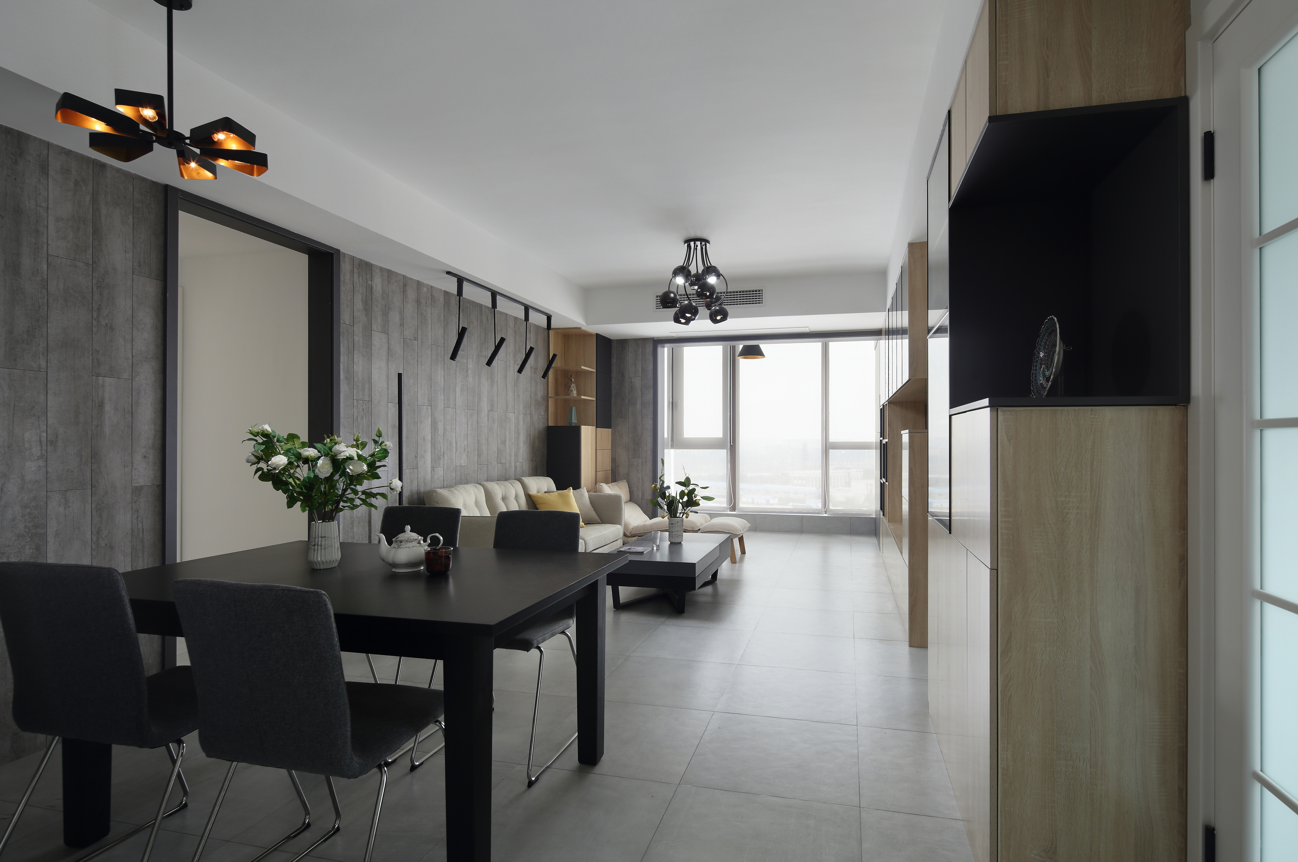 进门会感觉家里空间很开阔,得益于楼层的总体高度不高,又是边户,窗外的景色很好,因此没有在阳台和客厅之间做移门,客厅的电视机柜也得以一直延申至阳台,既保留了空